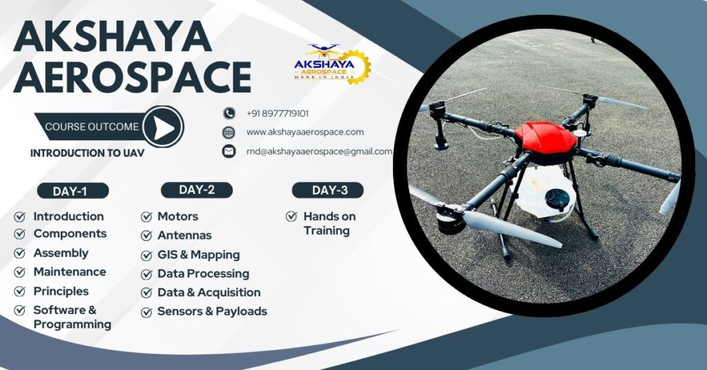 Akshayaaerospace presents a comprehensive 3-day Drone Training Course designed to equip participants with essential technical knowledge and practical skills required in the UAV (Unmanned Aerial Vehicle) industry. This program is ideal for students, professionals, and enthusiasts aiming to explore drone technology for various applications.